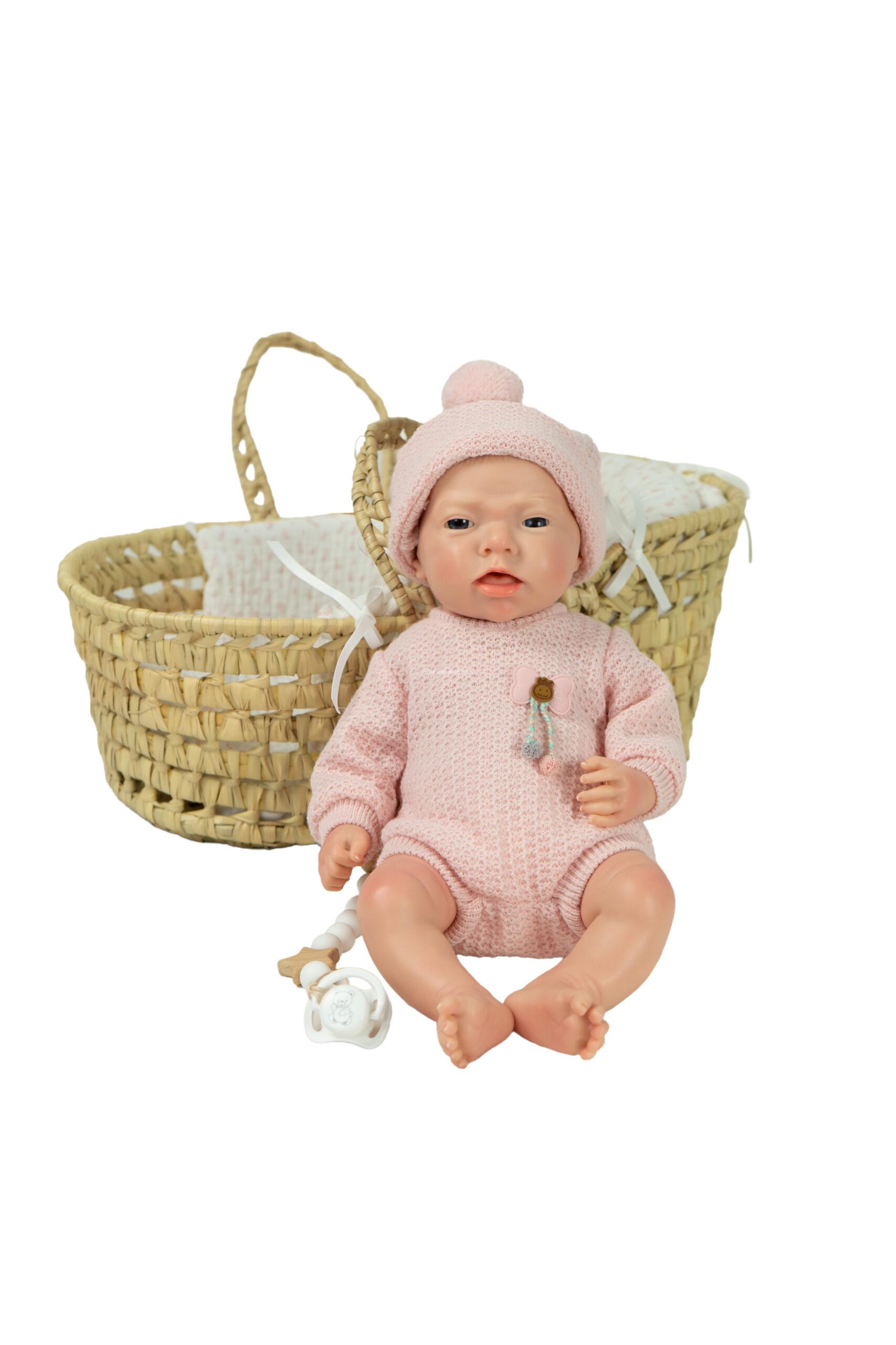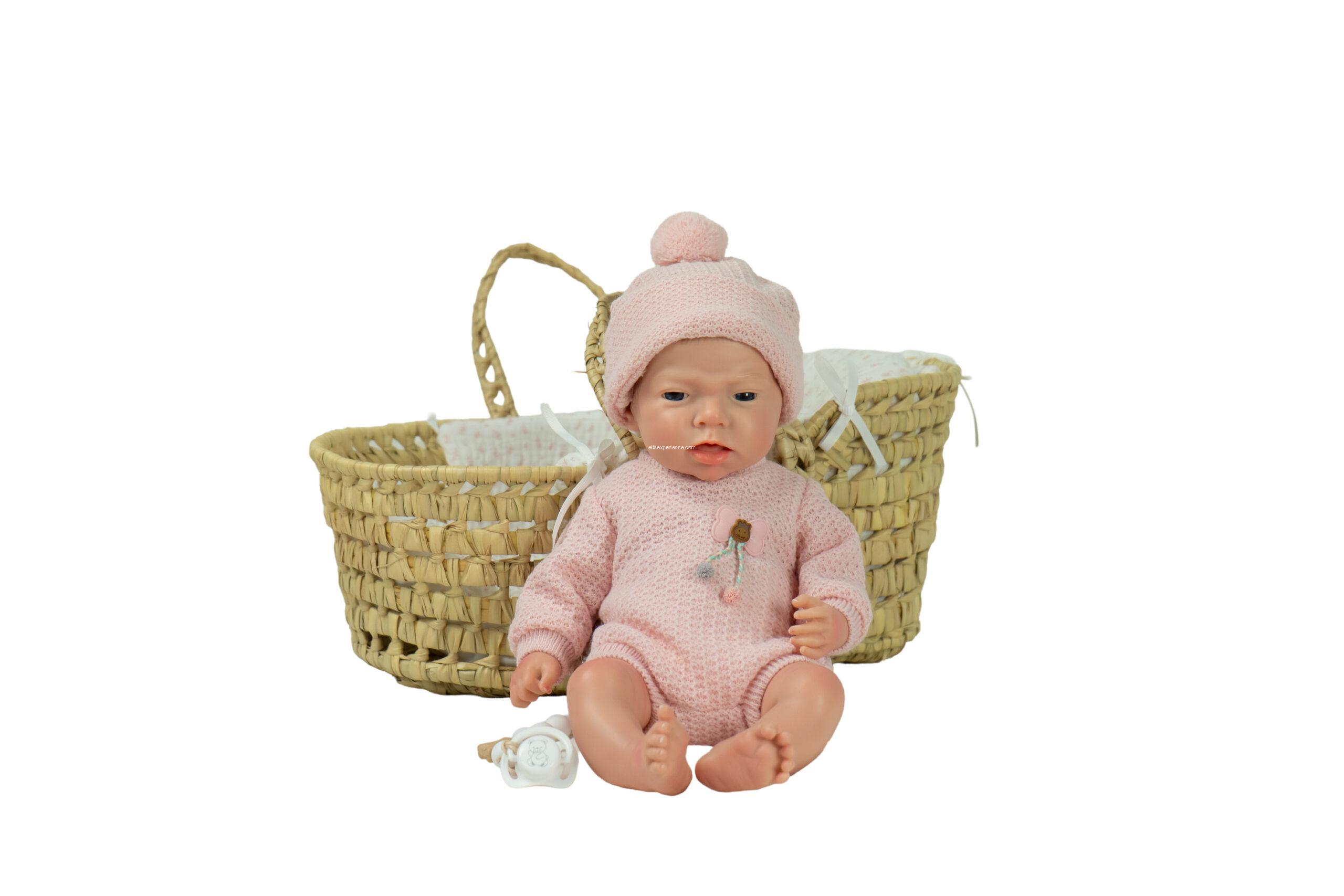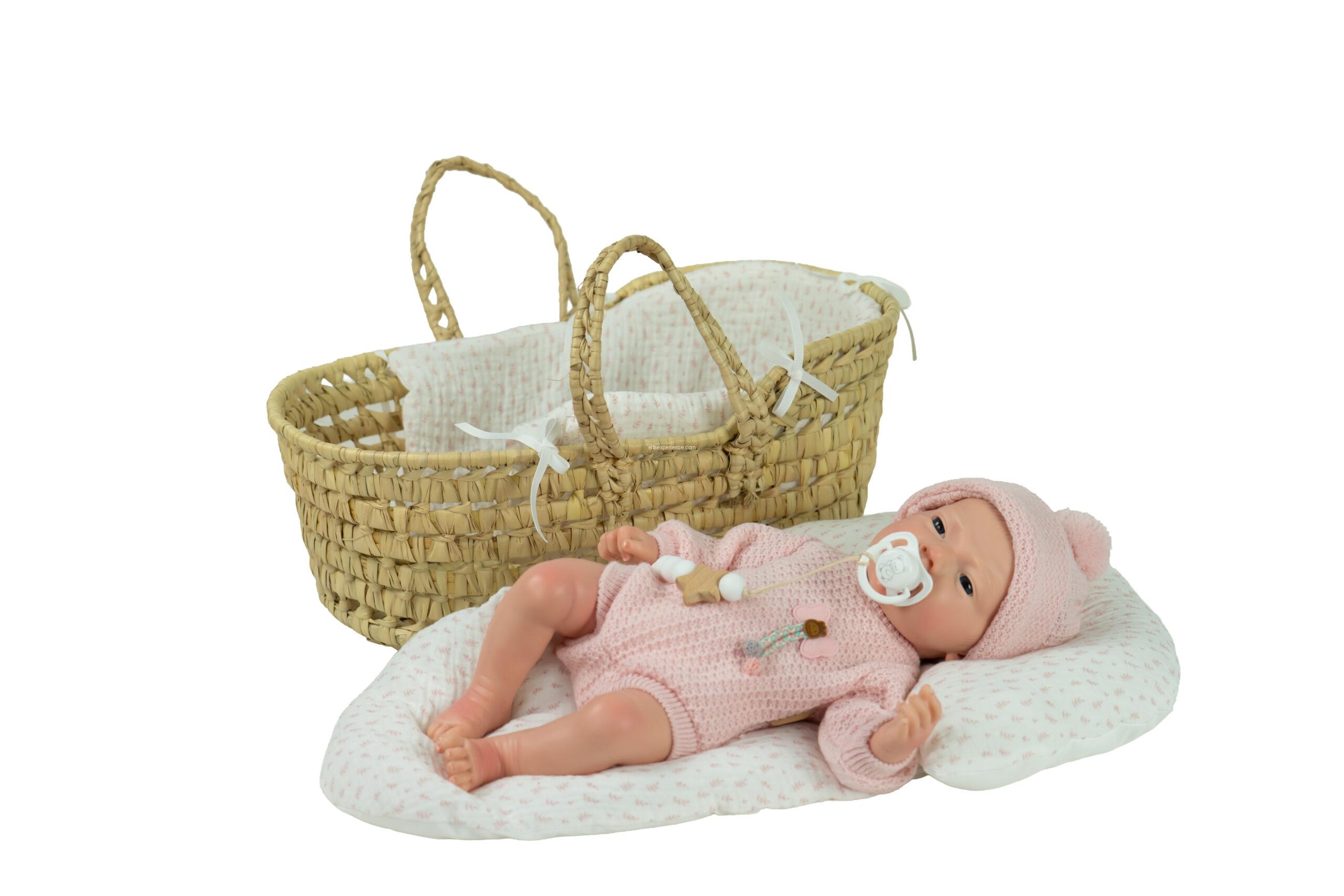 Incluye capazo de mimbre, chupete, pañal y certificado de autenticidad con cuidados para el reborn.