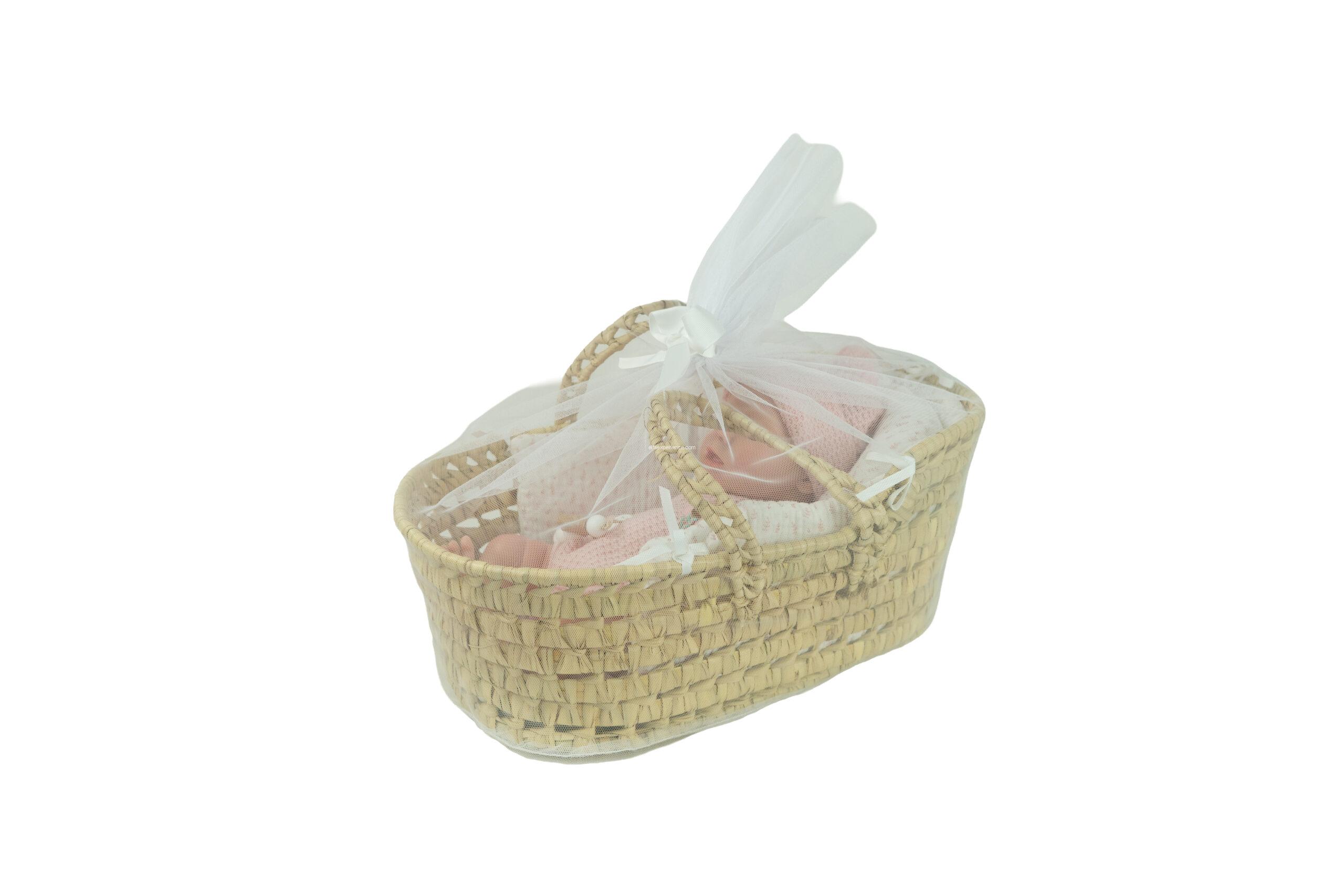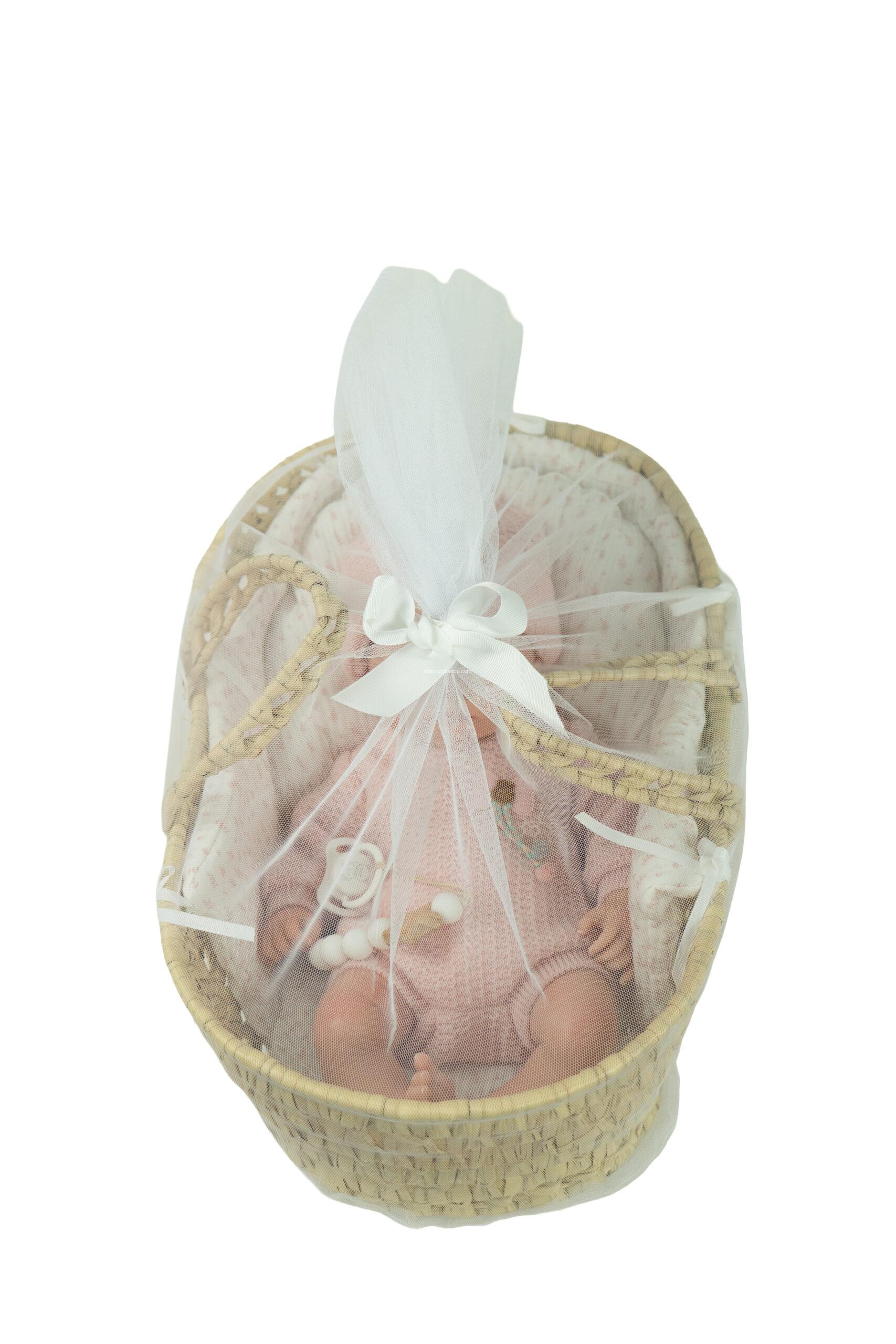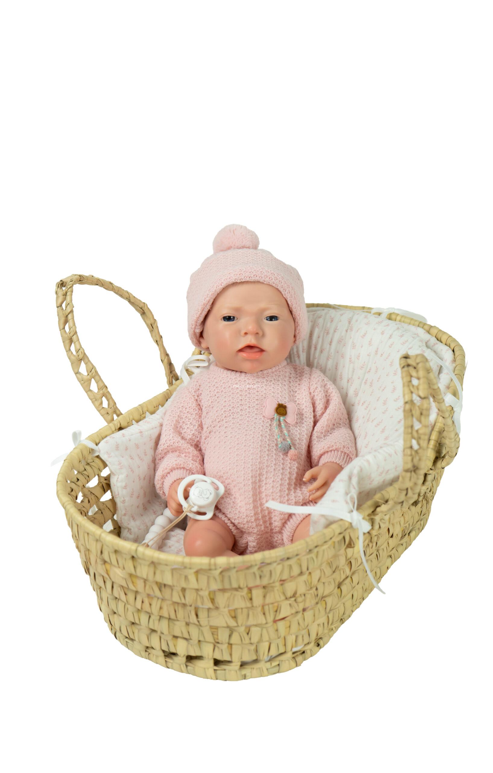 Incluye capazo de mimbre, chupete, pañal y certificado de autenticidad con cuidados para el reborn.